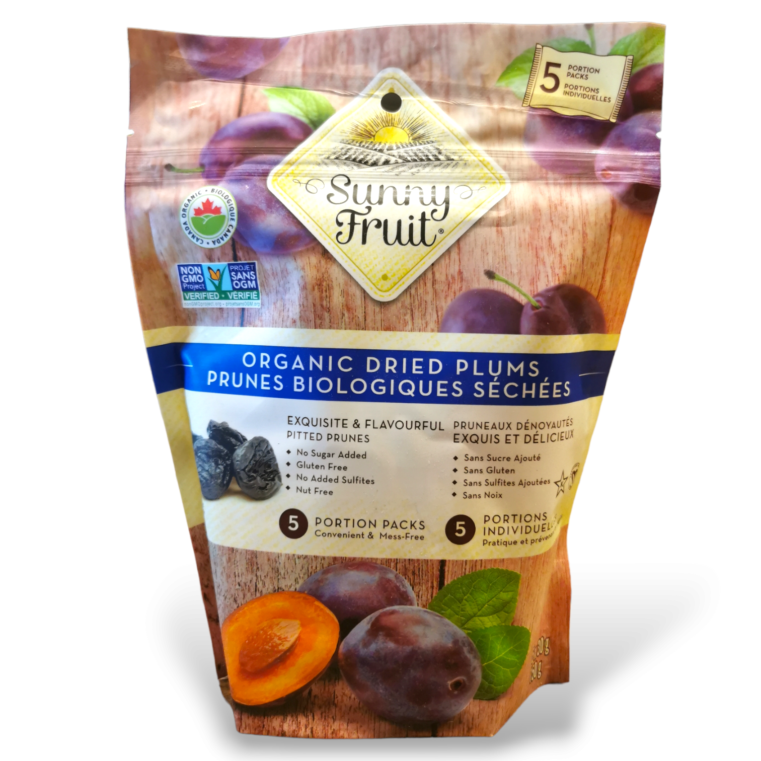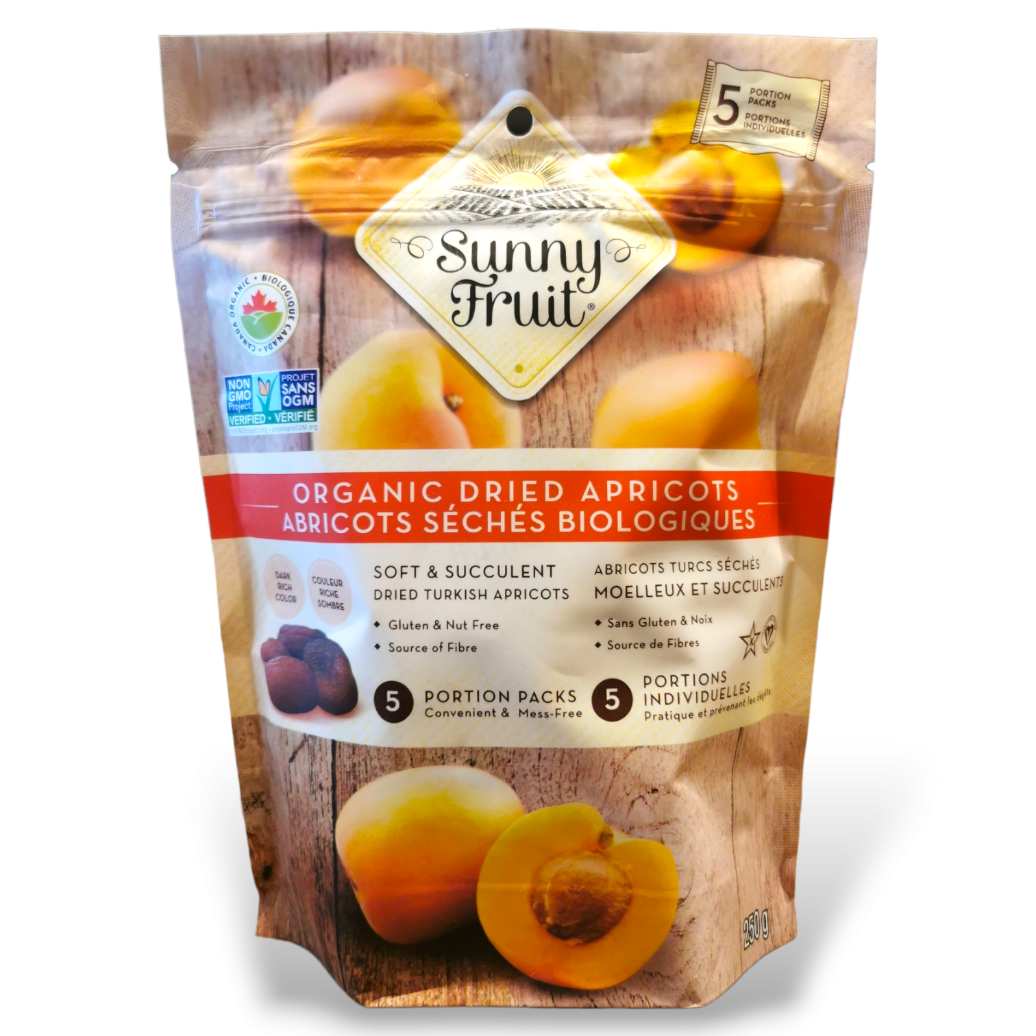 Canadian Certified Organic, non-GMO verified, Sunny Fruit dried fruits in convenient snack-size packs.